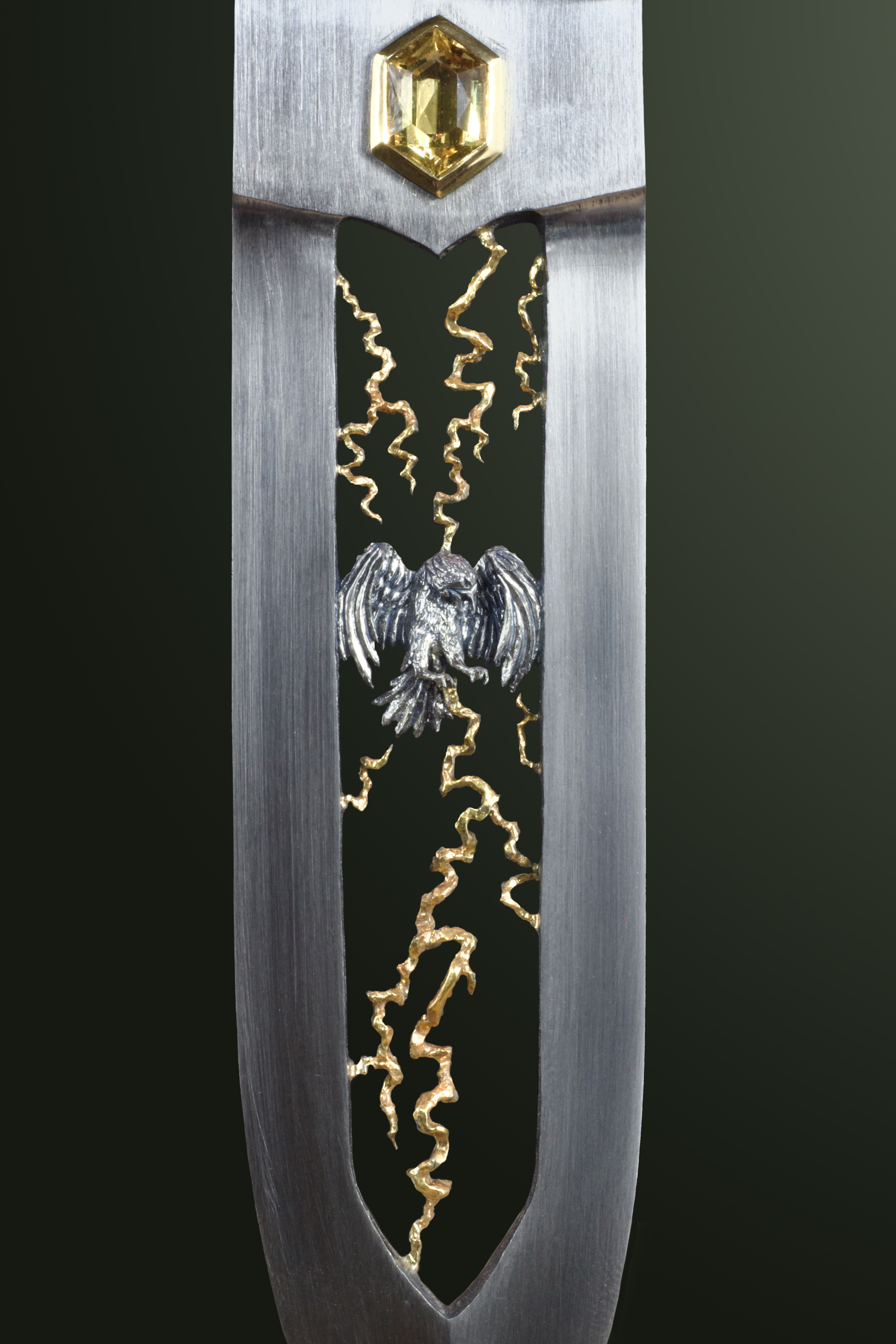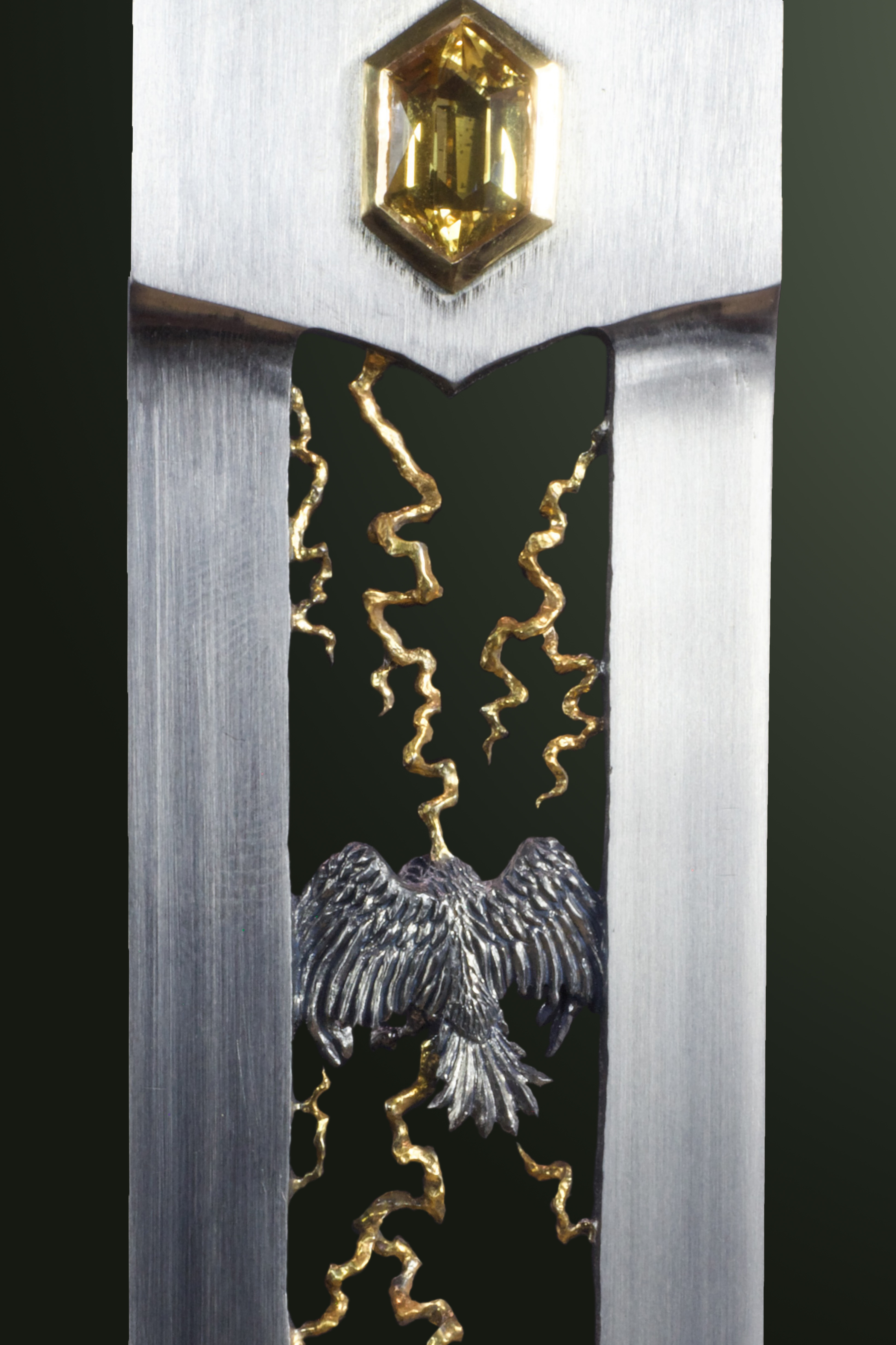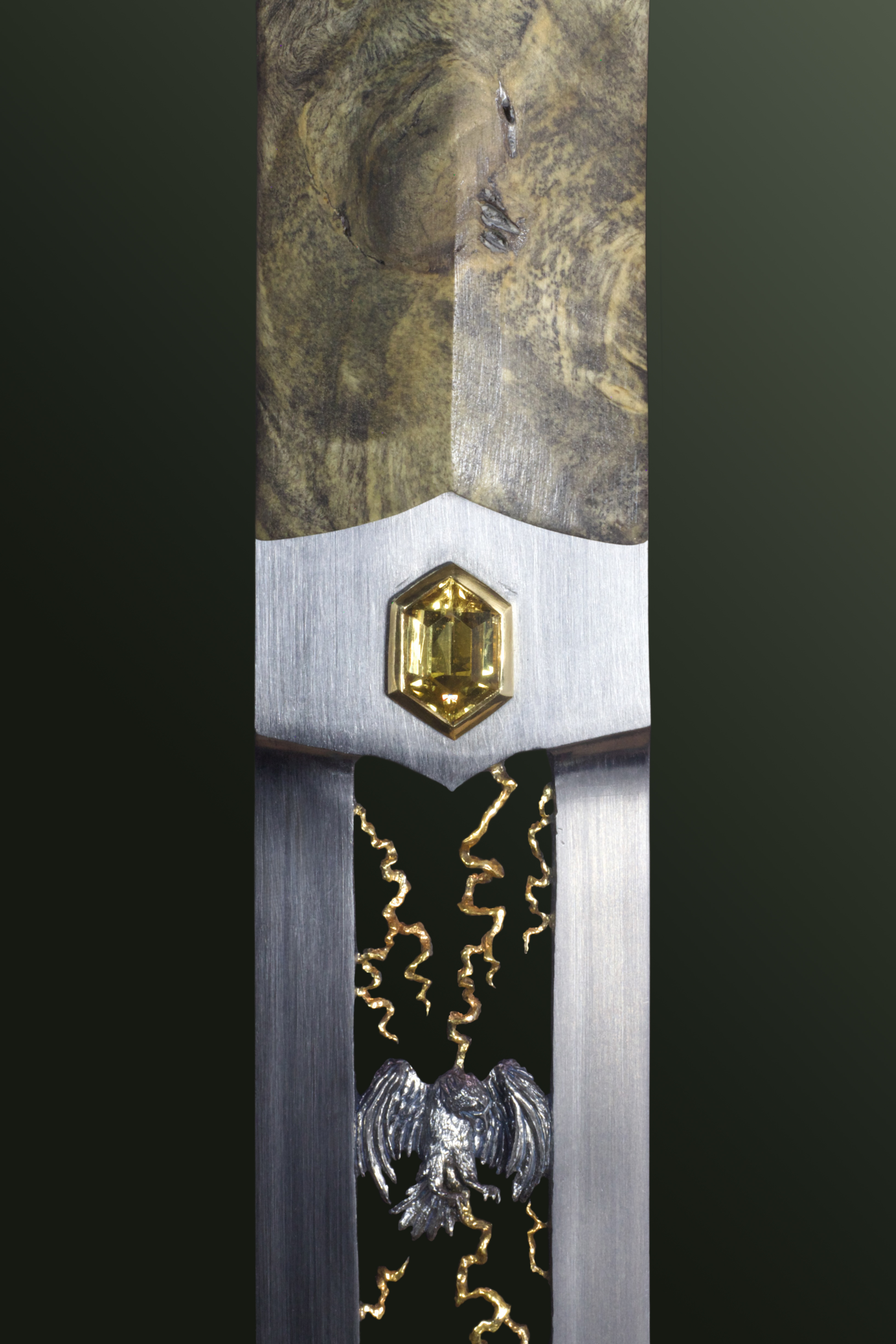 Cette pièce marque également un tournant technique dans mon travail, ouvrant un champ de possibilités presque infini. Elle incarne une évolution dans l’usage des matériaux, notamment avec l’introduction de l’or sous différentes formes : plaquage sur les éclairs, dorure à la feuille sur le bois du manche, et or massif pour les chatons logeant les citrines. Le défi résidait dans l’agencementde ces matières, afin de créer un ensemble harmonieux et vibrant.