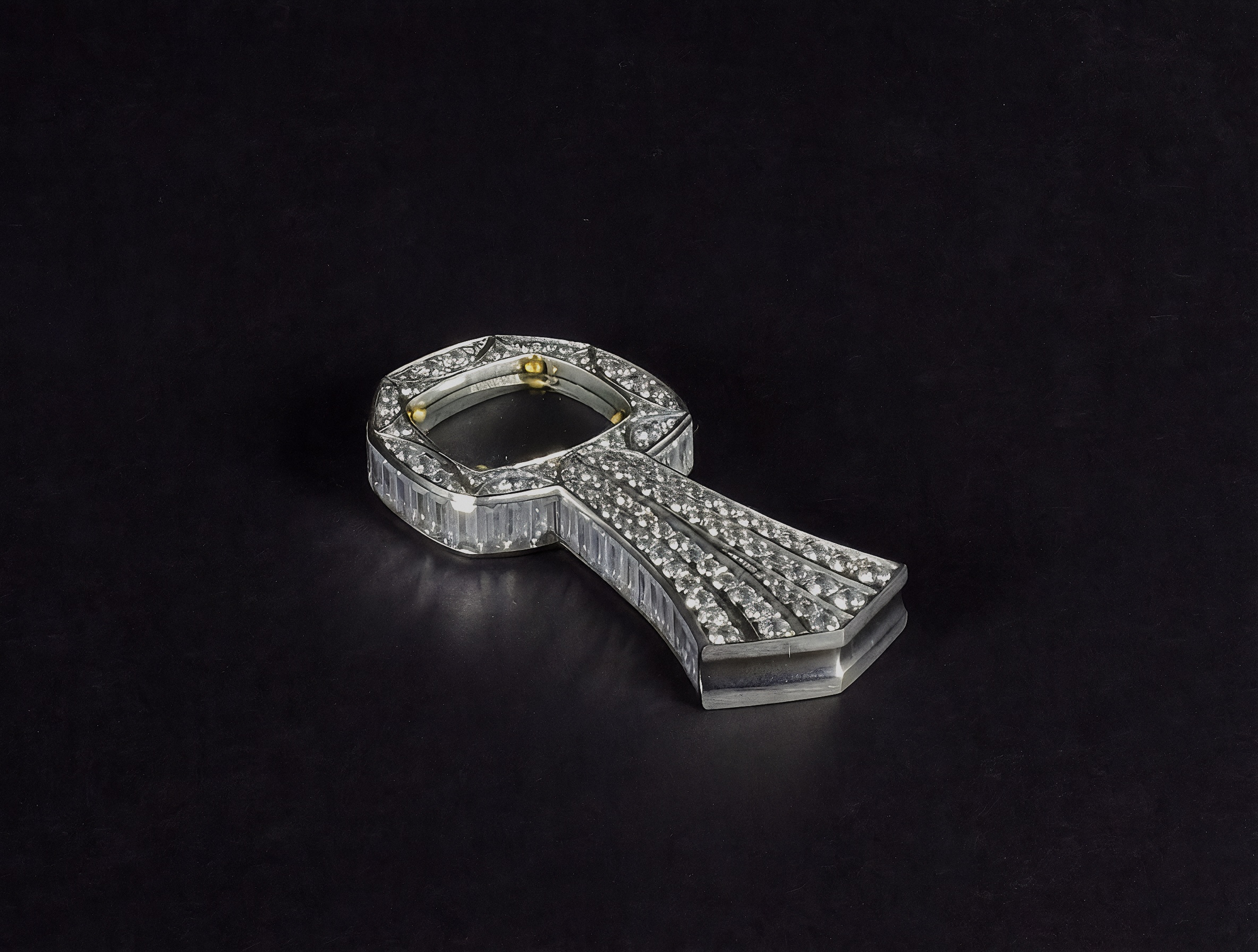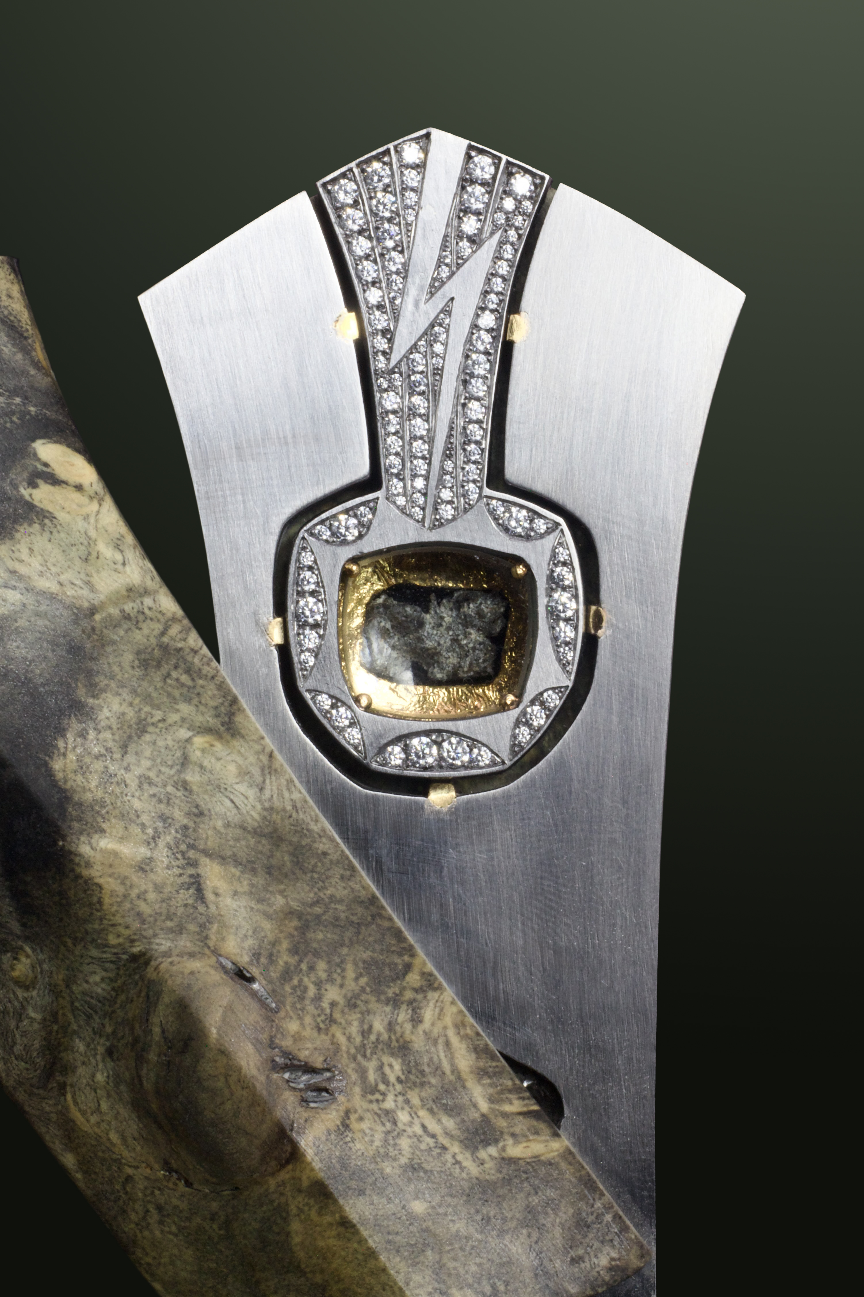 À travers cette création, j’ai cherché à susciter la surprise grâce à un mécanisme à secret. J'ai également voulu instaurer un dialogue entre la loupe — découpée dans l’acier inoxydable de la lame et entièrement sertie - et la sculpture principale, dont les détails se dévoilent sous sa lumière avec précision.